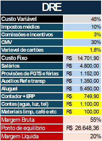 2. Ponto de Equilíbrio: Com o DRE em mãos, você consegue calcular o ponto de equilíbrio; quanto precisa vender para cobrir os custos e, a partir daí, começar a gerar lucro. Esse indicador te ajuda a entender o mínimo necessário para manter o negócio funcionando — e, mais importante, te mostra o potencial de reinvestir e expandir.